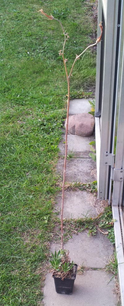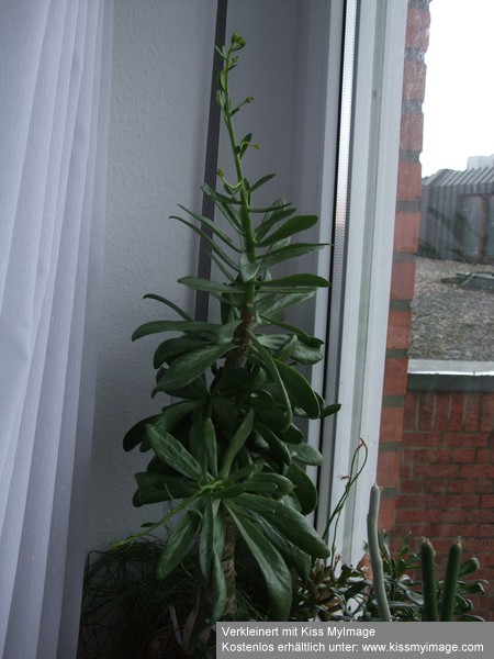 hier mal ein Bild von meinem Tylecodon paniculatus, das zum ersten Mal einen Blütenstand treibt: