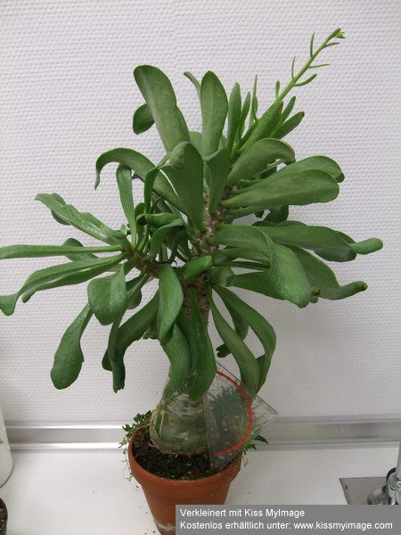 Hmm, meine T. buchholzianus machen komischerweise keine Blätter. Sie sind zwar im Trieb, aber Blätter habe ich da noch nie gesehen. Blühen tun sie aber, auf dem Bild sieht man den vertrockneten Rest einer Blüte:CABAC hat geschrieben: Mit meinen Tylecodon bucholzianum ist - wie man sieht - alles im grünen Bereich, Michael