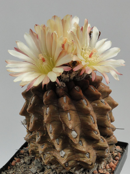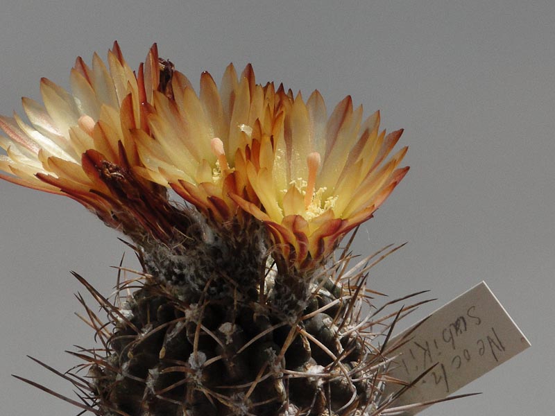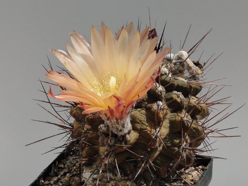 mit ungewöhnlich großer und blassgelblicher Blüte mit nur angedeutetem Mittelstreifen. - Vielleicht ist es auch eine Hybride mit etwas aus der Richtung Eriosyce heinrichiana?