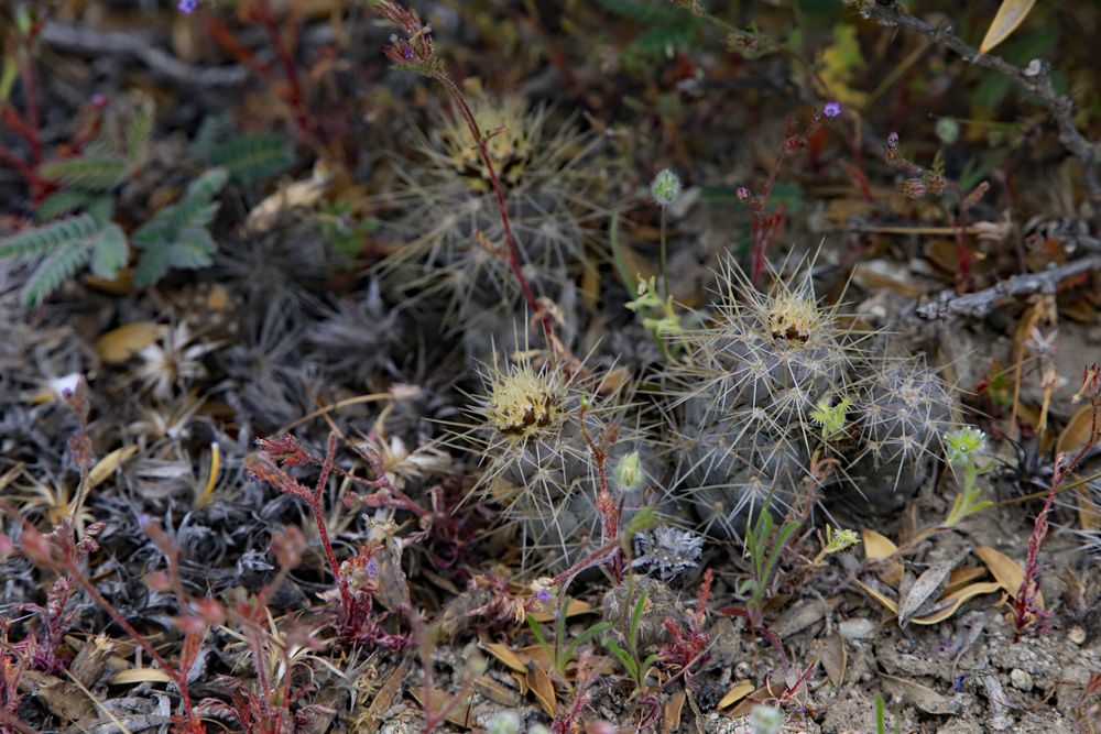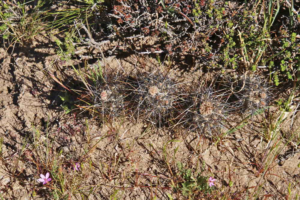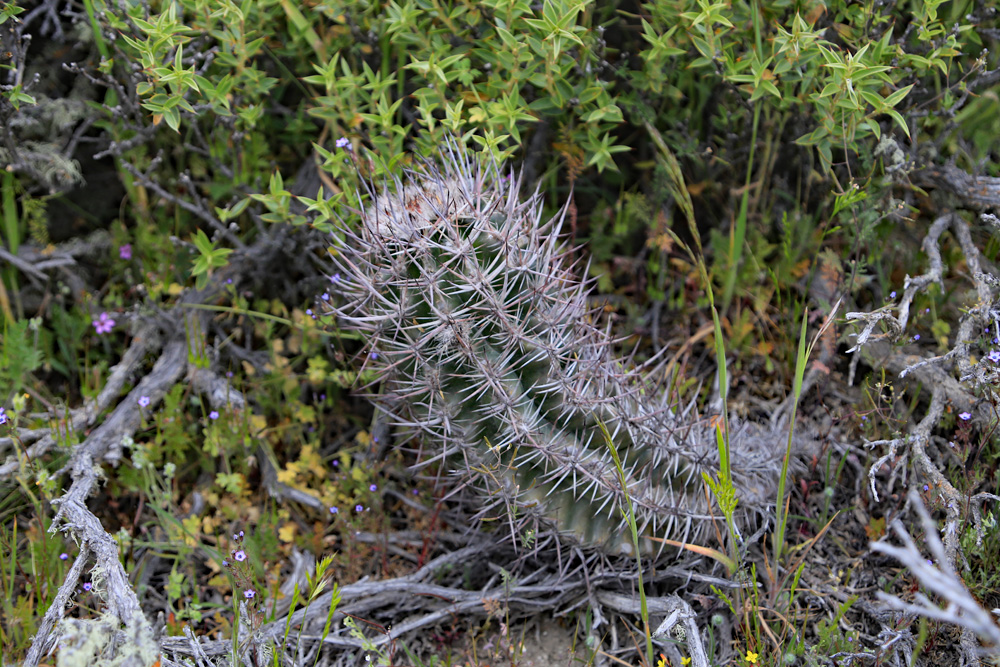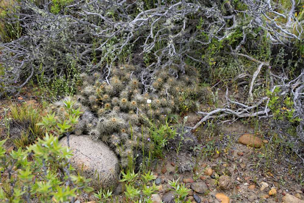 und auch die Pterocactus hickenii Pflanzen sind gut gefüllt. Solche Polster findet man nicht alle Tage. Auch der Rest der Vegetation erwacht zum Leben Kurz vor der Abfahrt zum versteinerten Wald halten wir noch einmal an, um uns die Beine zu vertreten.Die ersten Adesmias blühen schon und auch das Oxalis laciniata beginnt mit der Blüte. Die Austrokakteen an diesem Fundort sind ebenfalls gut gefüllt. Selbst die Bewohner extremer Standorte haben Wasser abbekommen. Jetzt wird es aber Zeit für den versteinerten Wald. Leider kann uns Regina nicht begleiten, weil sie von einem Virus schachmatt gesetzt worden ist.