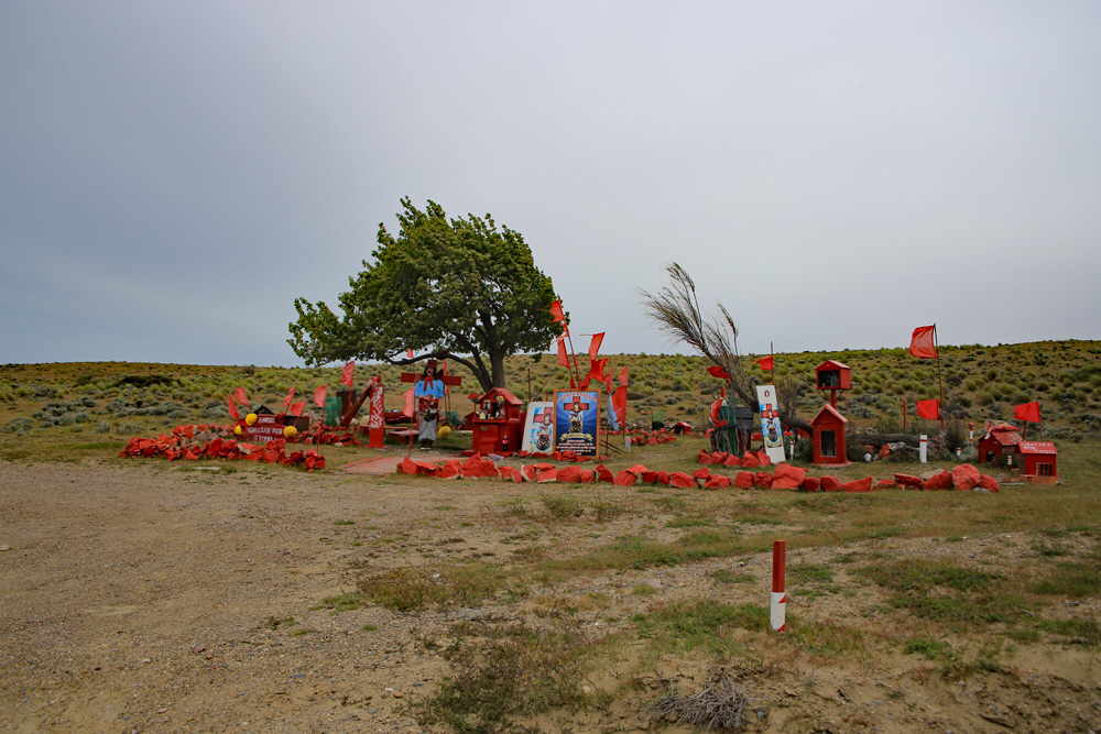 Gerade der Austrocactus auch mit Polstern, die man nicht übersehen kann. Wir erfreuten uns auch an den Calceolarien und dem farbenprächtigen Mohn. Das Tollste war allerdings ein Hügel, der von vielen Erdorchideen - Chloraea alpina - bewachsen war. Der Cañadon del Indio selber ist landschaftlich sehr schön gelegen. Nur das Wetter hätte etwas fotofreundlicher sein können. Zurück ging es über holprige Wege, vorbei an einer gut gepflegten Gauchito Gil Gedenkstätte.