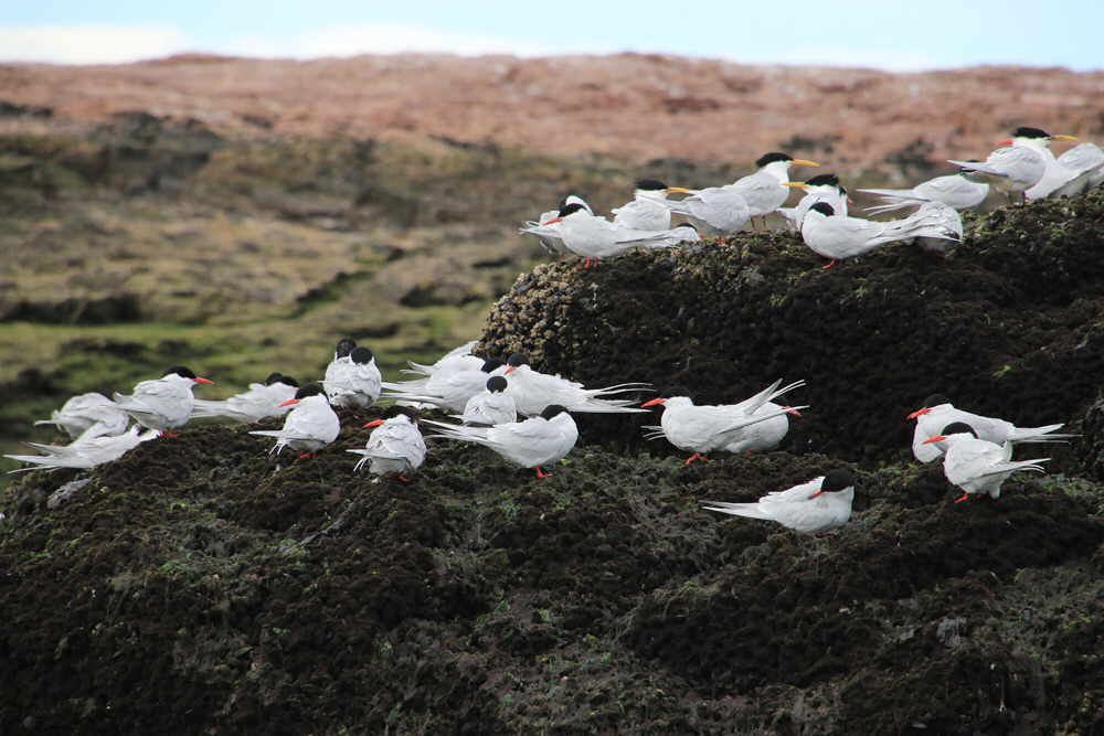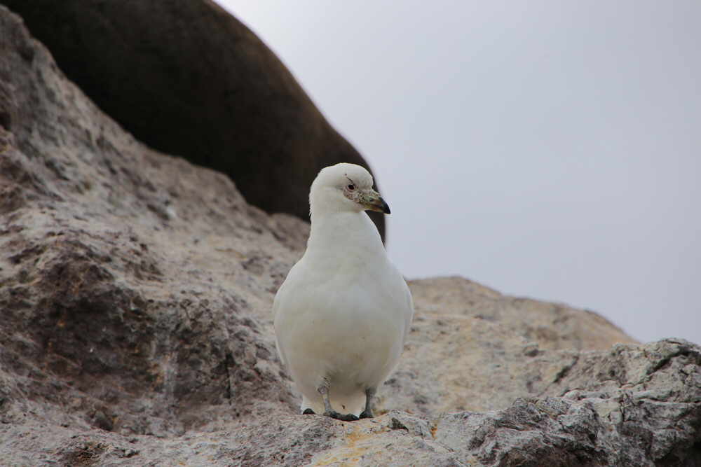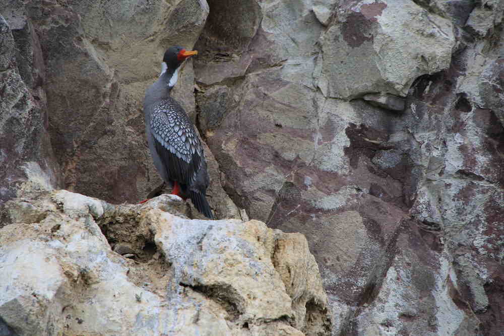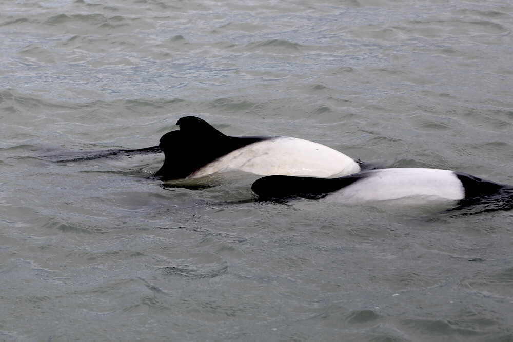 Neben Kormoranen gibt es dort auch die "Bandurrias" (eine Ibis-Art) zu sehen. Es gibt eine große Kolonie der südamerikanischen Seeschwalbe und die ersten Seelöwen waren auch eingetroffen.Allerdings noch erschöpft von der Anreise. Diese Paloma antarctica hat das gesamte Treiben im Blick. Etwas Besonderes ist der Stopp auf einer Insel in der Ria. Dort kommt man den Pinguinen sehr nahe - ohne Zaun. Ein weiteres - leider schwer im Bild einzufangendes - Highlight schwimmt im Wasser. Die schwarz-weiß gemusterten Commerson Delfine sind schnell, wendig und kamerascheu. Die Heckansicht ist leichter zu erhaschen.