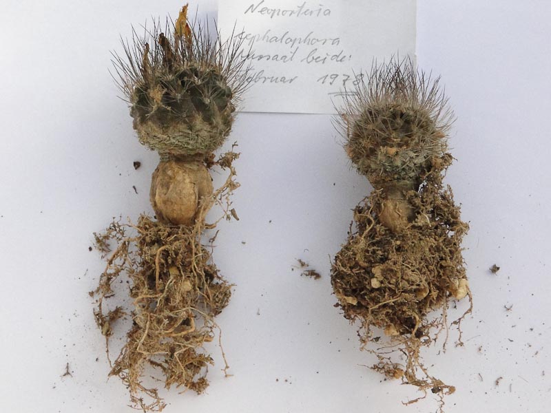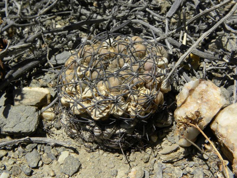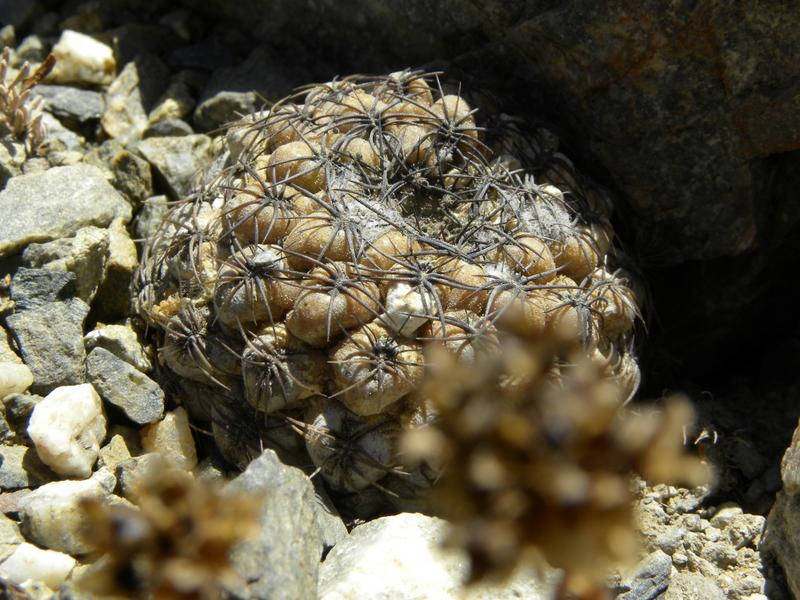 Wie man, glaube ich, ganz gut erkennen kann, sind diese Pflanzen viel derber als Eriosyce napina und haben ein ausgesprägtes Kinn unterhalb der Areole. Es gab sowohl Exemplare mit dunklerer als auch mit fahlgrüner Epidermis - vermutlich abhängig vom Stress durch Sonne und Trockenheit an ihrem jeweiligen Platz. Voll aufgeblühte Pflanzen haben wir leider nicht gefunden, was natürlich eine Bestimmung sicher erleichtert hätte.
