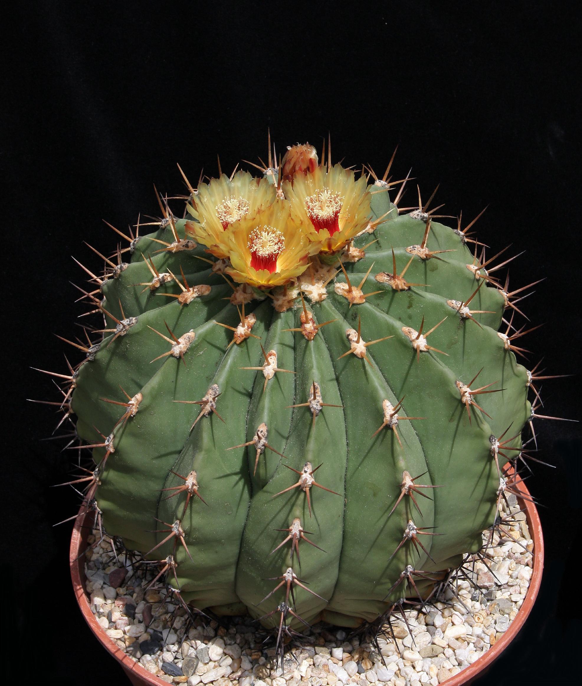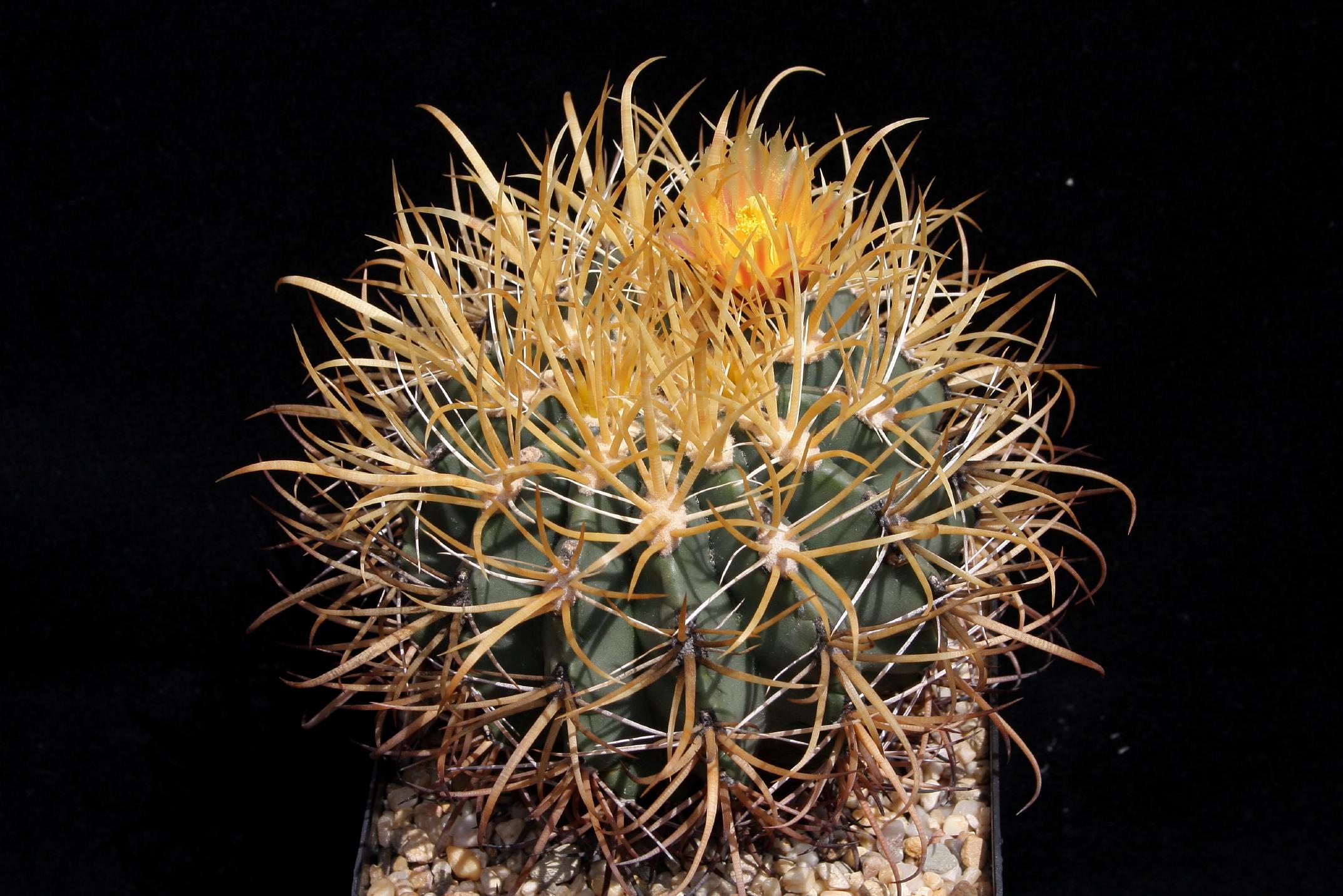 hier stelle ich einen "Erstlingsblüher" vor: einen Ferocactus chrysacanthus-Sämling von 2003 mit 9,5 cm Durchmesser und 8,5 cm Höhe.