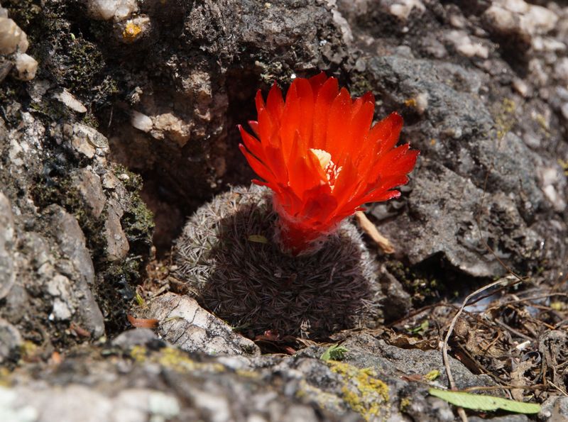 Einen wunderbaren Standort gibt es oberhalb des Friedhofs von Anquincila. Hier überraschten uns die ersten Parodien, zusammen mit Lobivia huascha var. rubriflora und Echinopsis aurea. Parodia malyana wächst hier teilweise inmitten der Huascha-Polster. Die Blütenfarbe ist hier einheitlich orange (in Tönungen). Wenige Kilometer weiter lässt uns eine Straßenböschung mit hunderten Farbtupfern erneut einen Stopp einlegen. Es sind wieder Parodien. Diese Population unterscheidet sich markant vom ersten Standort. Zum einen variiert die Blütenfarbe von gelborange über rot bis hin zu kamin. Zum anderen bleiben die Pflanzen winzig, maximal 3cm im Durchmesser. Diese Form hätte durchaus einen eigenen Namen verdient (zumindest wenn man die taxonomischen Kreationen einer G.bruchii als Maßstab sieht