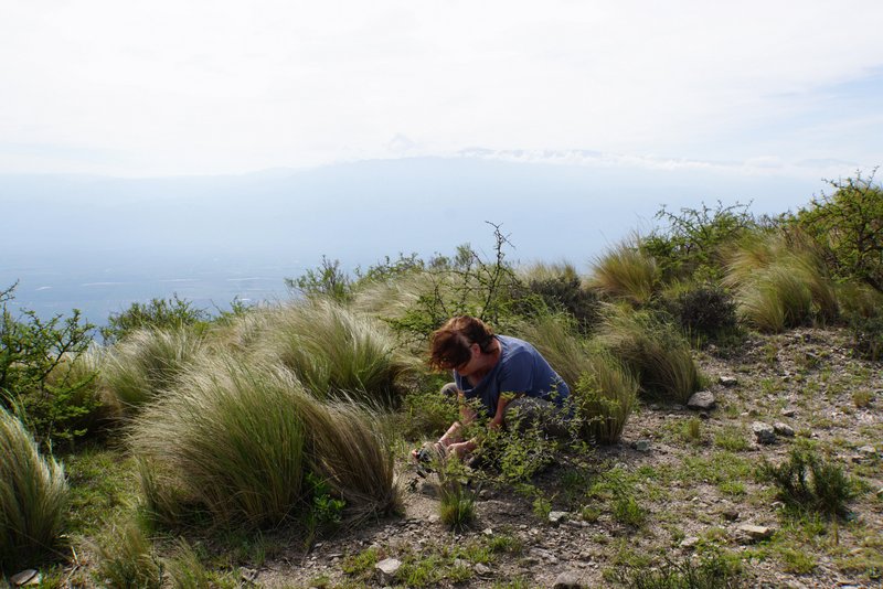 Auf den Höhen der Sierra Ancasti angekommen, wurde die Suche nach Gymnocalycium baldianum intensiviert. In einer Höhe von 1500-1600m verläuft die Straße entlang der nach Westen steil abfallenden Gebirgskante. Herrliche Ausblicke auf das Tal von Catamarca begeistern. Es ist sehr windig, schwülwarm und es sieht nach Gewitter aus (welches letztlich aber ausbleibt).