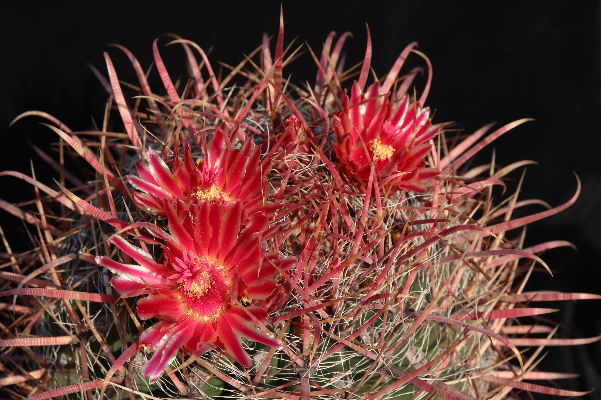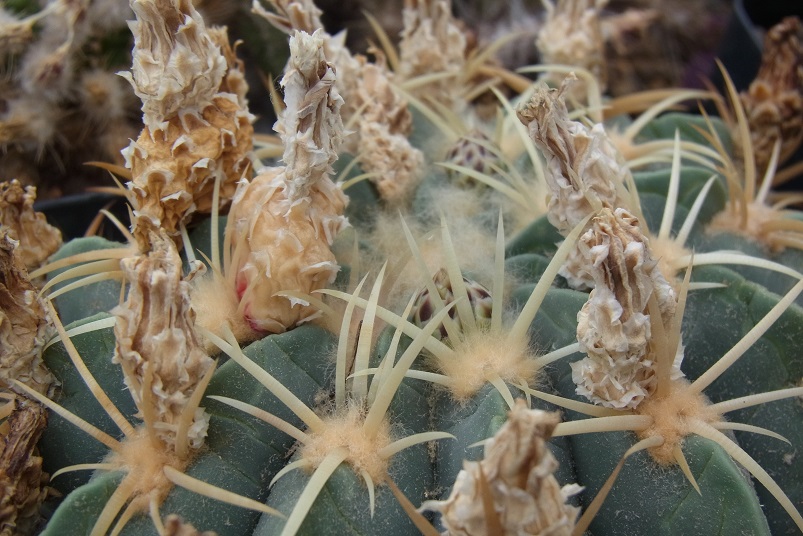 Ich habe nur eine Art, und zwar Ferocactus macrodiscus, und die Pflanzen sind noch weit zurück, dennoch zeigen sie in Anfängen die Knospen schon. Es wird wohl noch einige Wochen dauern, bis sie blühen.