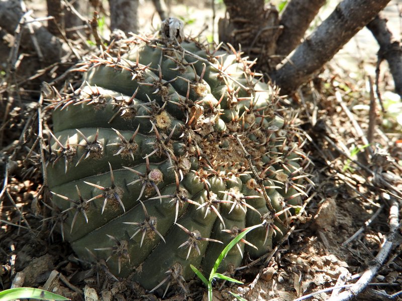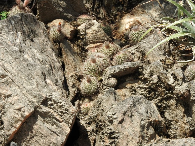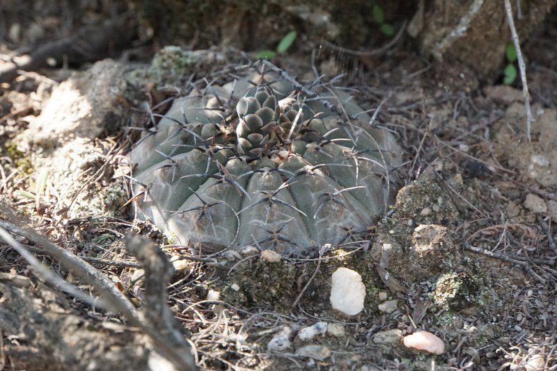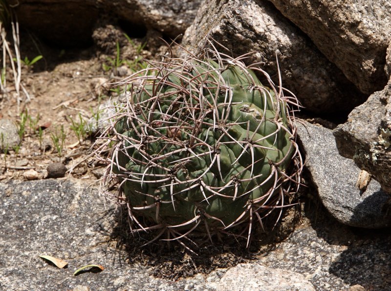 Tag 5: Catamarca - Miraflores - Cuesta de los Angeles - La Villa - Huillapima - Concepción (Sierra Ambato, Catamarca) An diesem herrlichen Morgen wollten wir die Cuesta de los Angeles, südlich von Catamarca besuchen. Gymnocalycium carminanthum soll es hier geben. Aber zunächst galt es, noch im Flachland bei Miraflores, das Gymnocalycium stellatum occultum aufzufinden. Gar nicht so einfach die Kerlchen zu entdecken und wir mussten erstmal ordentlich Blutzoll bezahlen. Dieses dichte Dornengestrüpp hat es in sich. Wenn man aber erstmal eines gefunden hat geht es Schlag auf Schlag. Unser erstes G.saglionis, das wir auch hier entdeckten, weckte wahre Begeisterungsstürme - was sich aber im weiteren Verlauf der Reise dank der Häufigkeit dieser Art schnell wieder legen sollte. Dann ging es auch schon hinein in die Berge. Wir hatten Glück - wenige Wochen vor unserer Ankunft wurde dieses schmale Sträßchen asphaltiert, dabei aber nicht ausgebaut, so dass die reich bewachsenen Straßenböschungen noch original erhalten wurden. Und da gab es vieles zu entdecken. Parodia microsperma catamarcensis in Massenbeständen, die bei der Rückfahrt am Mittag teilweise ihre hellgelben Blüten zeigten. Teils in voller Sonne, teils im tiefen Schatten, kopfüber hängend - wählerisch sind die Pflanzen wahrlich nicht. Auffallend die schwarzen Borsten an den Blütenkelchen. Die Parodien wachsen in einer Höhe von 700 - 1000m Höhe. Häufige Begleiter sind G.saglionis und Cleistocactus smaragdiflorus, letzter dank geöffneter Blüten leicht zu erkennen. Erst zu Hause beim Auswerten der unzähligen Fotos stellten wir fest, dass sich unter den zahllosen G.saglionis tatsächlich auch ein großes Exemplar von Gymnocalycium ambatoense, ein enger Verwandter von G.nigriareolatum und G.carminanthum eingeschlichen hatte. Unser Ziel heißt heute aber G.carminanthum - und da müssen wir noch einige Höhenmeter hinter uns bringen. Doch davon das nächste mal.