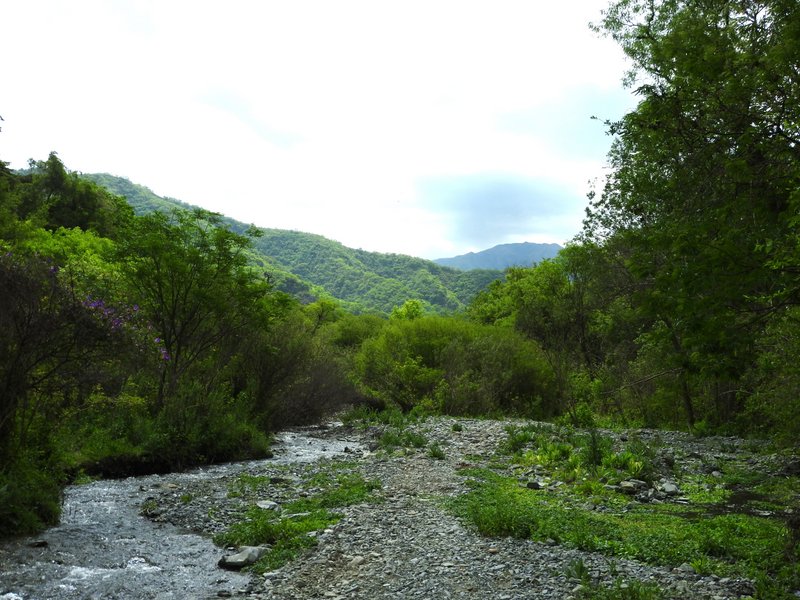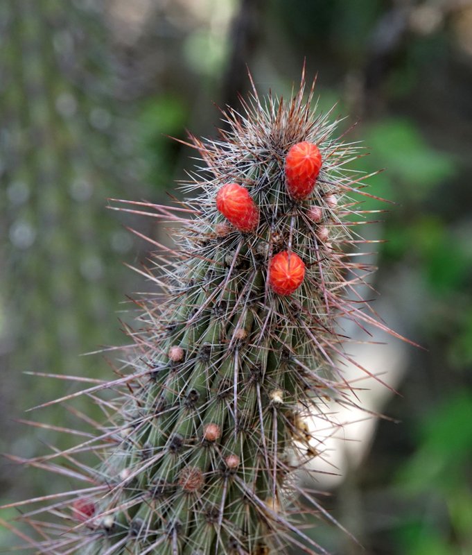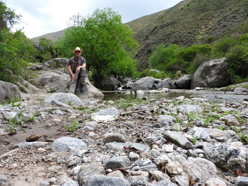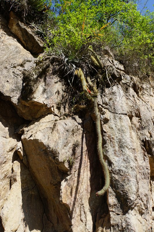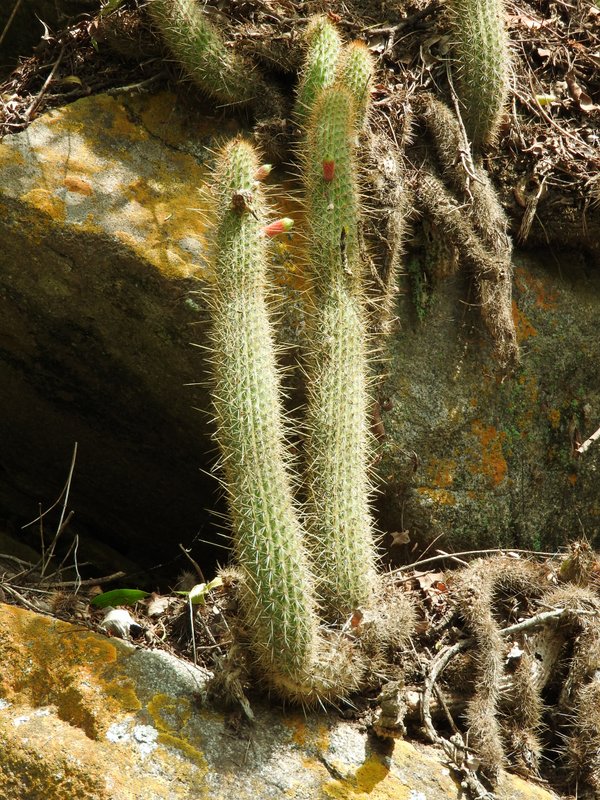 Die vielen Quittenbäume sind uns auch aufgefallen. Überall gab es "Dulce de membrillo". Übrigens meinte CABAC in Bezug auf G.occultum bei Miraflores die P131 (nicht P13). Dieser Standort wie auch die Cuesta sind offensichtlich sehr beliebt bei den Argentinienreisenden - wen wundert es, gibt es hier doch auf kürzester Distanz so vieles zu entdecken. Den Abschluss des Tages bildete eine Wanderung durch das Tal des Rio Pampichuelas, westlich von Conception, etwa 20 km südlich von Miraflores. Hier kann man auf einem schmalen Pfad entlang des Baches den Bosque (=Wald) de Arrayanes erkunden. In schwülheißer Luft windet sich der Pfad entlang des Baches durch subtropische Vegetation. Nicht unbedingt eine geeignete Umgebung um Kakteen zu finden. Aber es gibt ja auch noch die Epiphyten und schon bald fanden wir üppig mit Rhipsalis aculeata bewachsene Baumriesen. Papageien und knapp faustgroße Spinnen (keine Vogelspinne!) erinnern daran, dass wir nicht zu Hause sind. Gigantische Exemplare von Opuntia quimilo stehen hier in Blüte und an den felsigen Prallhängen des Flusses wächst Cleistocactus smaragdiflorus. Auf dem Rückweg wollte ich unbdingt nochmals G.occultum sehen. Also ging es bei Huillapima wieder rein ins Dornengestrüpp. Die Hitze war hier unerträglich und die heftigen Proteste meiner Frau waren durchaus berechtigt. Kein Windhauch sorgte für Abkühlung. Am Horizont ballten sich die Wolken über der Sierra Ancasti. Aber auch heute gab es wieder kein Gewitter. Wir waren uns einig - ein Fund reicht, dann gehts zurück ins klimatisierte Auto. Kaum war die Vereinbarung getroffen kam auch schon der erlösende Ruf aus dem Unterholz. Wunderschöne G.occultum waren Belohnung dieses Zwischenstopps. Ein Cleistocactus gab sich ebenfalls die Ehre. Morgen wird uns die Reise weiter nach Norden führen. Tafi del Valle in Tucuman ist das Ziel, doch davon später...