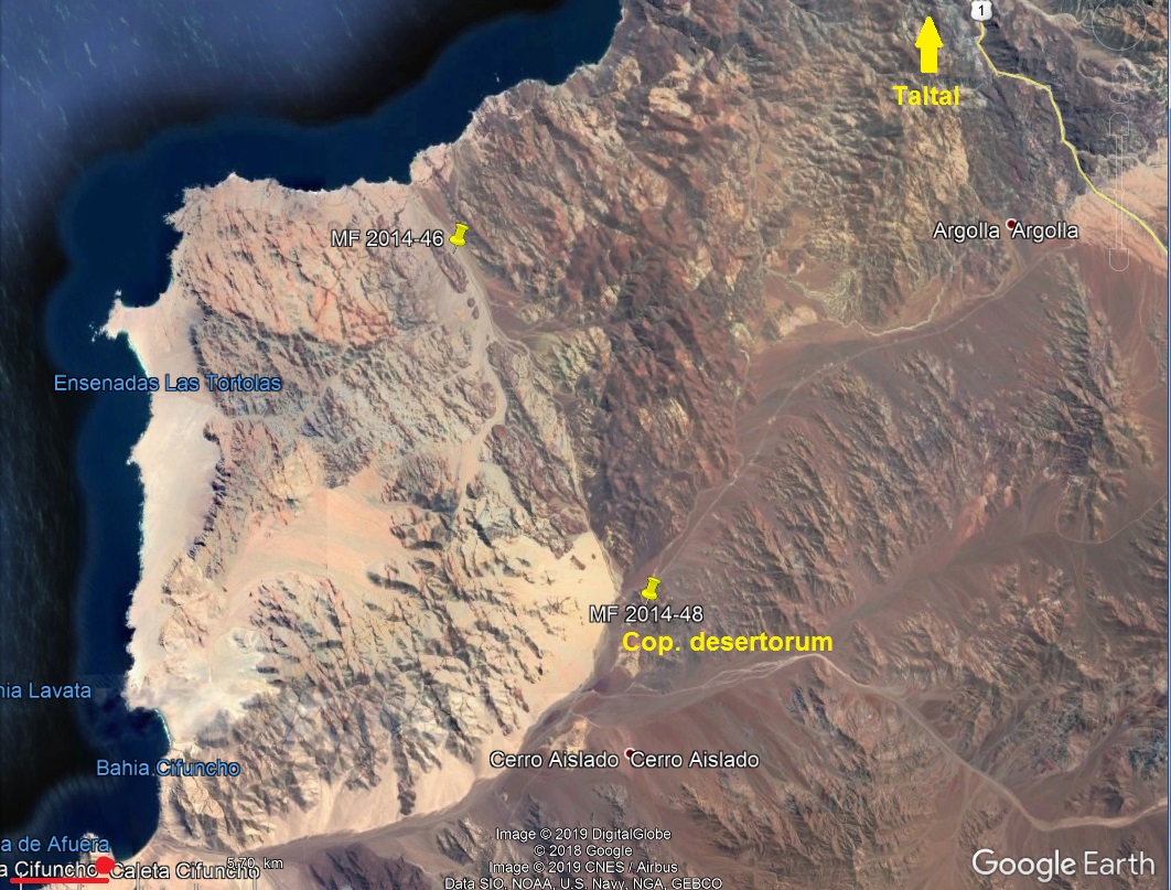 Da wir die Pflanzen auch (im Cachina-Tal) bei Placilla Esmeralda gefunden haben und dieses ebenfalls der Verbreitungs-Karte in COPIAPOA 2006 für Cop. taltalensis entspricht (Seite 71, der südliche Zipfel), habe ich eigentlich keinen Zweifel daran, dass es sich dabei auch um Cop. taltalensis handelt.