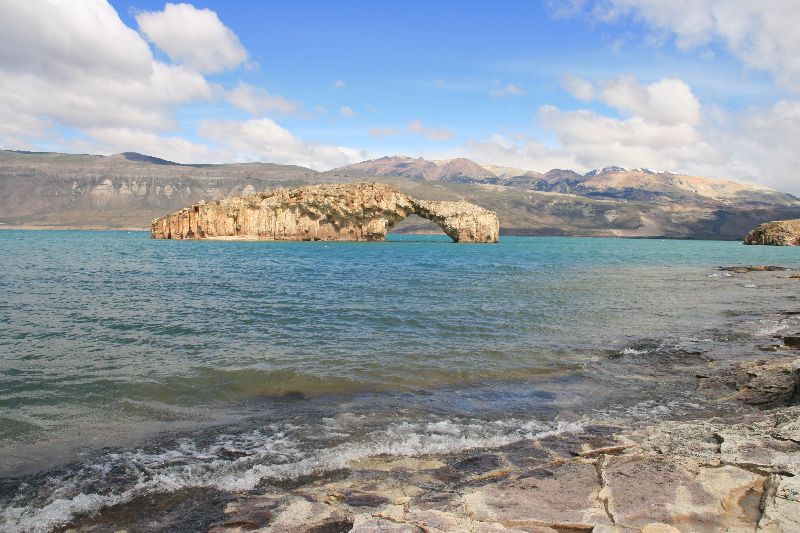 Blickfang im Lago Posadas ist die Felsenbrücke. Der deutlich größere Lago Pueyrredon schmückt sich mit grünen Felsen.