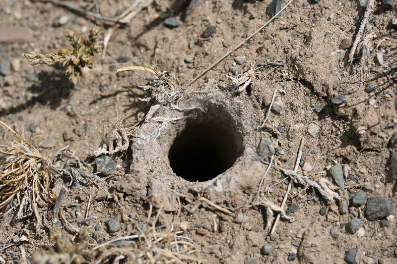 Dass jegliches Interesse für die Natur bei der Kakteensuche behilflich ist, erlebten wir am Nachmittag. Beim Fotografieren des Loches einer Trichterspinne bemerkten wir unmittelbar daneben eine Jungpflanze von Pterocactus hickenii zusammen mit einem Pterocactus australis.