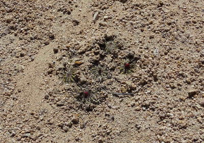 Streift man mit den Fingern durch den Sand, so kann man vereinzelt Sämlinge von Cop. columna-alba finden. Die Samen keimen unter der Sand-Oberfläche, wo es scheinbar immer noch hell genug für die Lichtkeimer ist. Erst bei einem Durchmesser der Sämlinge von einem oder zwei Zentimetern stößt der dann bedornte Scheitel durch die Oberfläche.