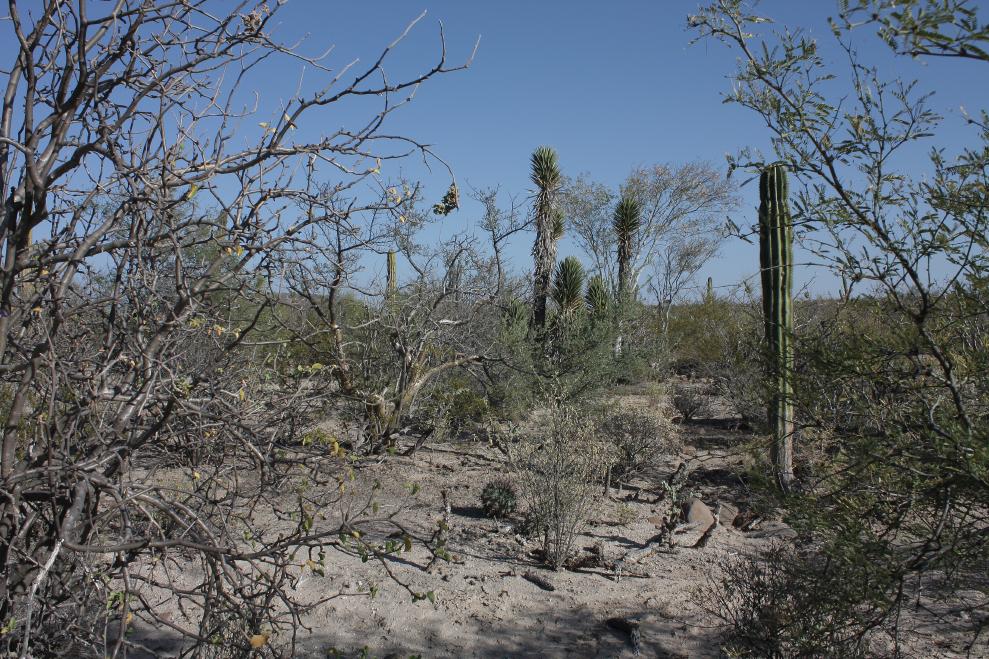 Von den Lavaströmen waren es nur noch 40 km bis zu unserem Hotel in San Ignacio. Nach dem Einchecken im „Desert Inn San Ignaciao“ ging’s nochmal ins Feld, entlang der Straße, die außerhalb des Ortes geteert war, gen Süden in Richtung Laguna San Ignacio. Rechts und links der Straße waren die Flächen meist eingezäunt, aber es gab Stellen ohne Zaun (oder Stellen mit nur einer Andeutung von Zaun …).