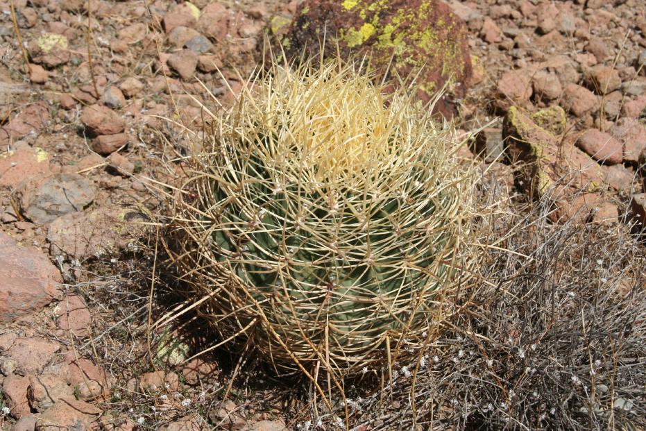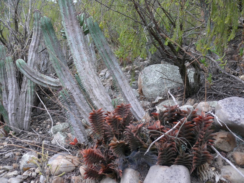 Zunächst ist hier alles recht trocken. Wir finden Mammillaria karwinskiana confusa, Euphorbia radians und Ferocactus macrodiscus.