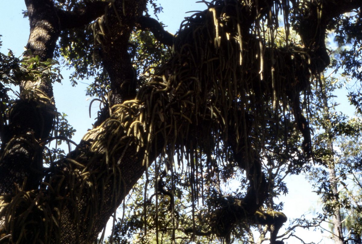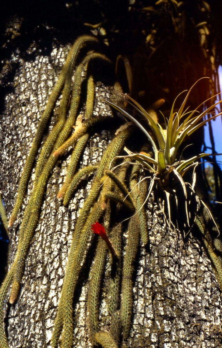 Mit zunehmender Höhe erreichen wir einen feuchten Bergnebelwald. Alles ist voller Epiphyten. Die Baumriesen werden von der bekannten Zimmerpflanze Fensterblatt (Monstera deliciosa) und diversen Orchideen und Tillandsien besiedelt. Aporocactus flagelliformis flagriformis finden wir mit einzelnen Blüten.