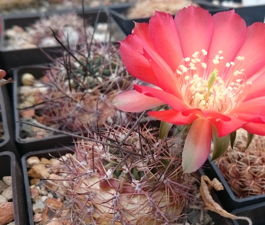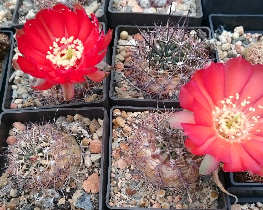 hier nun ein paar Bilder von diesem Jahr. Mittlerweile entwickeln sich die langen schwarzen Mitteldornen. Leider haben die Pflanzen im Frühjahr einen schweren Verbrennungsschaden erlitten. Ich hoffe sie erholen sich wieder, aber es sieht ja nicht schlecht aus.