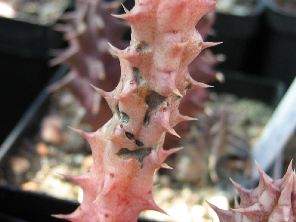 Eine Huernia hat mit sehr kleinen Punkten angefangen, die rasch flächiger wurden und bis ins Leitbündel gingen - da habe ich ganz schnell die gesunden Ableger abgetrennt und den Rest weggeworfen.