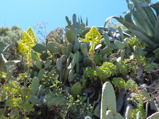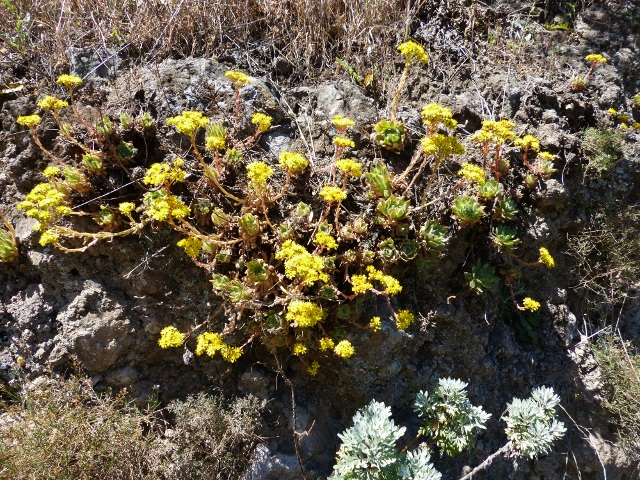 Am Rande von Lorbeerwälder blühene Aeonium undulatum und zwei Aichryson Species.