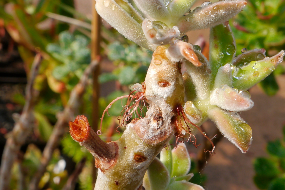 So sieht das Schadbild aus, wenn die Pflanze die Speichelgifte abwehren kann. Man sieht deutlich, das der Trieb unterhalb und das Ende oberhalb völlig vital sind. Und so sieht es aus, wenn der Trieb abstirbt. Auch sind die Triebstücke unterhalb und oberhalb vital (Wurzelbildung).