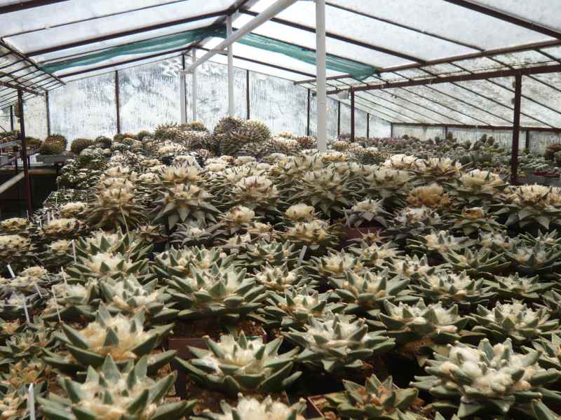 Er führte uns zuerst in seine Sämlingsanzucht. Ich wollte mir mit Brille die Sämlinge etwas genauer betrachten, die Luftfeuchte war so hoch, dass es keine Durchsicht gab. Die nächsten Häuser waren gefüllt mit der Aufzucht. Man sah es den Pflanzen an, dass sie sich sehr wohl in diesem Klima fühlten. Im Anschluss kam für uns der Höhepunkt: die Sammlung die Ariocarpen von Karel Rys. Seine ältesten selbst ausgesäten Sammlungspflanzen sind ca. 40 Jahre alt. Im Anschluss führte er uns noch durch zwei kleine Verkaufshäuser.