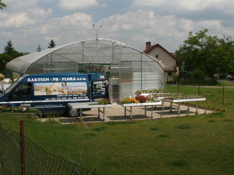 Die Fahrt südlich um Prag war auf Grund von starkem Verkehr recht zeitaufwändig. Wir näherten uns der Adresse und fuhren noch durch „America“, dann waren wir schon fast angekommen. Die Einfahrt in die schmale Strasse linker Hand ist leicht zu übersehen. Erst einmal gefunden, kommt dann links das Schild „Kaktusy“, dann ist man angekommen. Wir wurden herzlich von Karel Rys empfangen und durch seine sehr umfangreiche Sammlung geführt. Die Gewächshäuser sind gegen Sonneneinstrahlung mit einem weißen Anstrich geschützt. Die alten Häuser haben nur wenige und sehr kleine Lüftungen. Daher ist es bei Sonnenschein bullig warm darin.