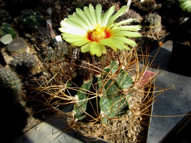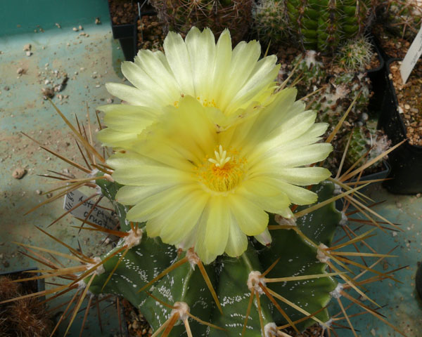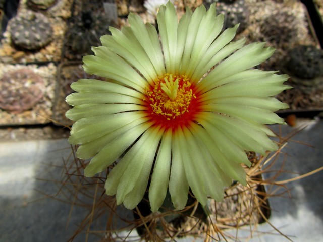 Unser Freund Sporbi aus Nieder-hinter-unter oder -oberotterbach hat dieses Astrophytum 'kraussii', quasi ein weißstachliges Astrophytum capricorne v. senilis ohne roten Blütenschlund, nach der Wende im Westen eingeführt.