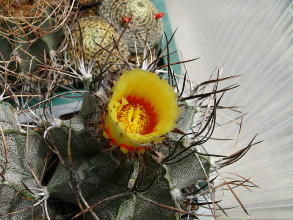 Pflanze mit fünf sich öffnenden Knospen und Coryphantha pulleineana.