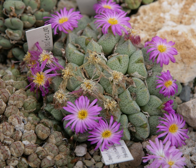einen hab ich auch noch blühend gefunden. Auf dem Schild steht: Conophytum minutum subsp. pearsonii 'glabrum' Bitterfontein.