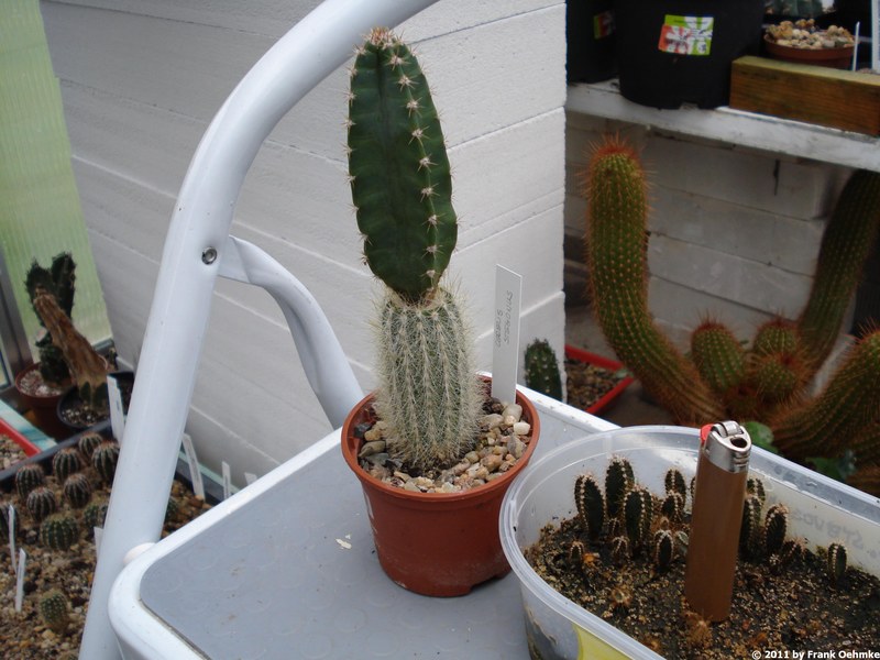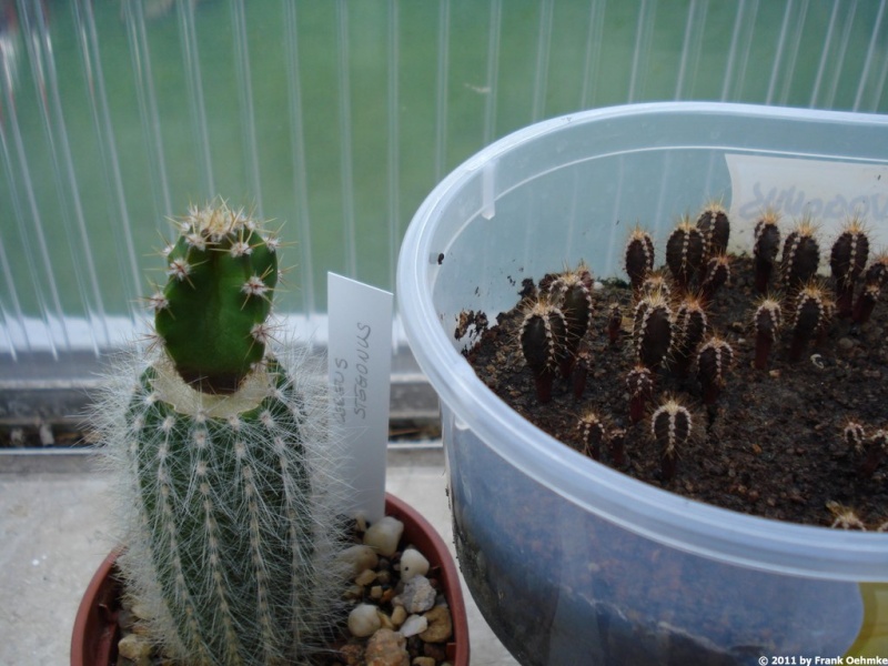 Nun gut, Anfang April habe ich Standortsamen von Cereus stegonus über Alex Arzberger bekommen, die ich sofort gestreut habe. Nach dem Auflaufen habe ich einen Sämling auf Cleistocactus straussii gesetzt, ab ins Zimmergewächshaus, keine besonderes Luftfeuchtigkeit (wie bei Pereskiopsis), sondern nur gespannte Luft und die Luftfeuchtigkeit aus dem Substrat.