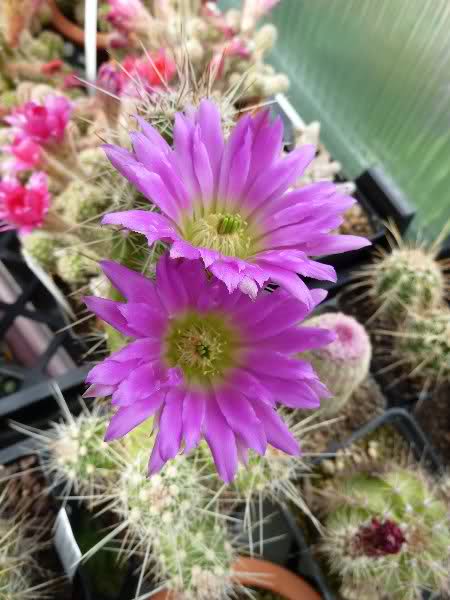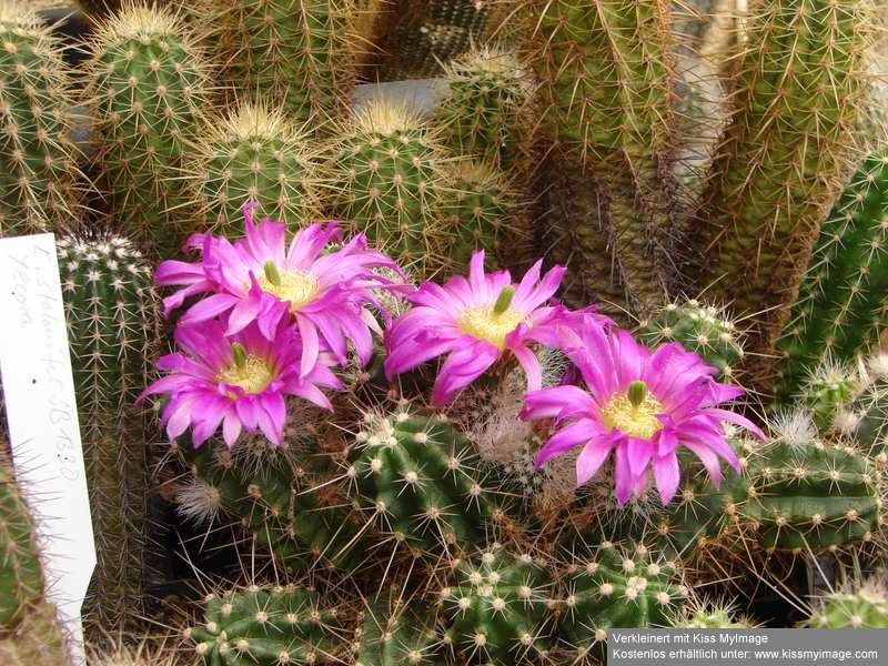 Zur Kultur. Die Pflanzen lieben ein mineralisches Substrat, sie gedeiht im Gewächshaus gut, wogegen sie in Frühbeetkultur bald besser zu Recht kommt. Sie ist sehr weichfleischig und ich würde den Pflanzen keinen Frost zumuten. Die Blühwilligkeit ist sehr unterschiedlich, ich habe schon bei Kakteenfreunden Pflanzenpolster von über 1m Durchmesser leide mit nur einer Blüte gesehen, andere Vertreter blühen schon als kleine Pflanze. Schade das diese Gruppe in unseren Sammlungen nicht sehr häufig anzutreffen ist, denn sie hat auch ihre Reize und rundet die Vielfalt innerhalb der Echinocereen gut ab.