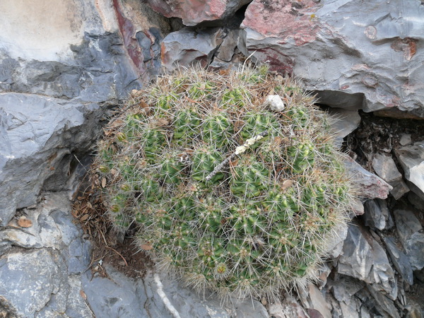 zu deinen Ecer. parkeri - Bildern möchte ich noch einige Standortfotos beifügen. Das erste Bild entstand an der Straße von La Escondida nach Aramberri, Nuevo Leon, Mexiko, auf einem Felshügel. Die Pflanze wurzelte in den ziemlich morschen Felsstücken in den Spalten. Alle übrigen Bilder entstanden an der felsigen Straßenböschung nördlich von Ascension im gleichen Bundesstaat. Die Pflanzen wachsen auch hier in den Felsen am Straßenrand, die beim Straßenbau mal entstanden waren. Manche Polster wachsen auch oberhalb der Straße an hellen Stellen im Kiefernwald, sehr oft in schwarzem Humusboden. Zwischen den Felsen herrscht mineralisches Substrat vor. Fast jedes Polster ist anders bedornt, mal länger, mal kürzer. Das Gleiche gilt auch für die Trieblänge. Auch die Blüten sind unterschiedlich kräftig gefärbt.