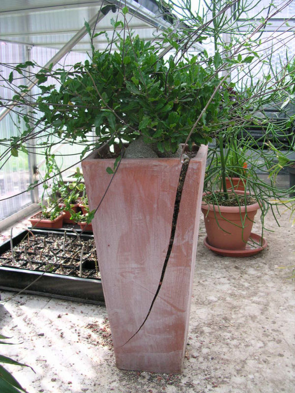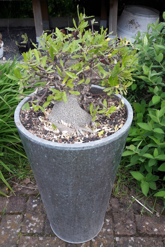 Schäden durch die Ameisen konnte ich nicht feststellen. Der Caudex ist beeindruckend dick - 25 cm Durchmesser (gemessen auf Höhe der Substratoberfläche) und "hoch" (ca. 50 cm, gemessen vom Astansatz bis zum unteren Ende). Ein ziemlich massiver Block, der sich in den letzten zwanzig Jahren - so lange habe ich die Pflanze - entwickelt hat. Damals war es ein bestenfalls 2-jähriger Sämling in einer 10-cm-Bonsaischale mit verklebtem Kies als Abdeckung des Torfsubstrats, gerettet aus einem Fachgeschäft.