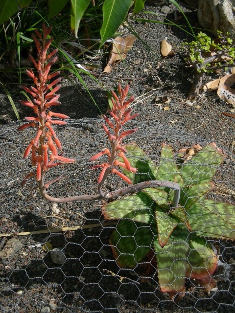 Aloe greatheadii v.davyana. Der Draht ist gegen Kaninchenfraß, Kaninchen fressen gern gesprenkelte