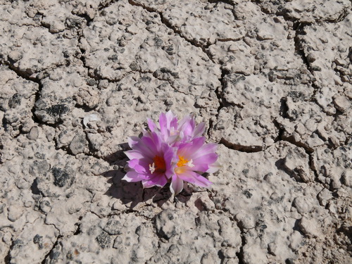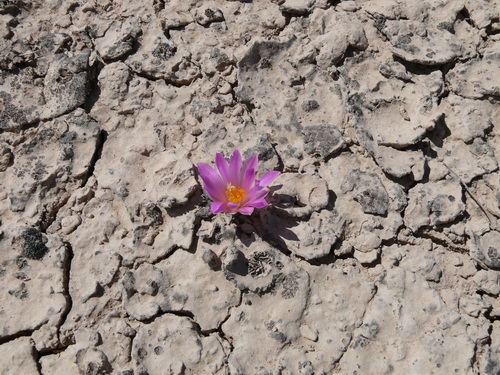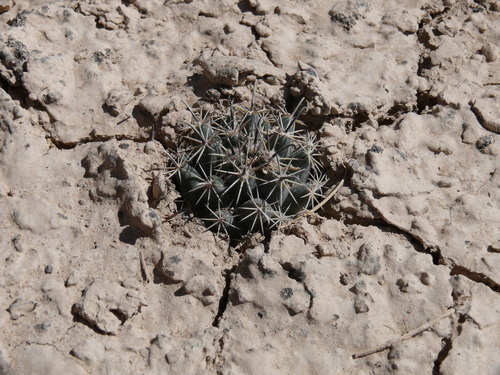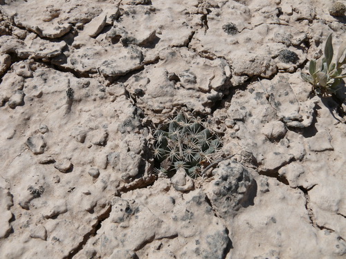 In der Heimat wachsen die Pflanzen in Schwemmgebieten und sind hier sehr schwer zu finden, um sie zu fotografieren. Das Finden wird noch dadurch erschwert, dass die Pflanzen sehr selten und winzig klein sind. Sie wachsen in einer Schwemmlandebene, deren Oberfläche durch die Trockenheit in unzählige kleine Felder zerrissen ist. Sehr oft wachsen sie in den Kreuzungspunkten der Risse noch vertieft in einem Loch. An Begleitpflanzen gibt es hier noch Ariocarpus kotschoubeyanus, die man nur durch die Blüten gesehen hat. Die 3-cm-Pflänzchen waren völlig mit Lehm zugespült und –geweht. Ferner gibt es hier noch ebenso kleine Pflanzen von Coryphantha hintoniorum ssp. hintoniorum. Man sieht hiervon ganz selten in den Kreuzungspunkten der Bodenrisse ein paar schwarze Hakendornen. Dann gibt es noch Mammillaria heyderi und coahuilensis, die beide in der gleichen Art und Weise wachsen und auch die gleiche Größe haben. Es wachsen noch einige wenige Kakteen hier, der Ort ist sehr interessant.