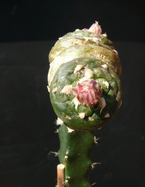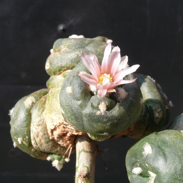 seit einiger Zeit ist eine weitere Lophophora-Art bekannt. Sie wächst unter anderem auch im Bundesstaat San Luis Potosi in Mexiko. Hier konnte ich die Pflanzen vor einigen Jahren mit Freunden am Naturstandort beobachten. Da ich auch einige Korn Samen von Freunden erhielt, konnte ich die Pflanzen auch aussäen und nachziehen. Die Sämlinge wurden nach dem Keimen auf Pereskiopsis und Selenicereus gepfropft, um sie schneller groß und blühfähig zu bekommen. Durch das Pfropfen haben die Sämlinge stark gesprosst, was ich auch bei anderen Arten festgestellt habe.