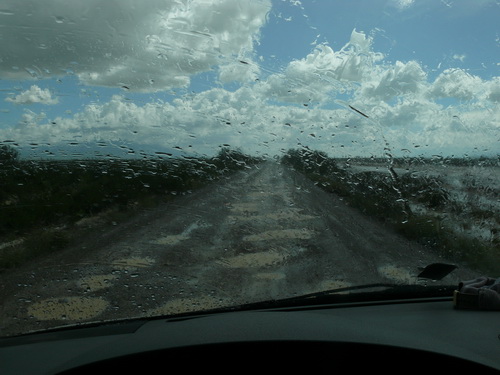 so lange sind wir nicht da geblieben. Der Guß hat vielleicht eine knappe halbe Stunde gedauert. Wir waren froh, daß wir wieder im Auto waren, nicht auszudenken, wie wir ausgesehen hätten, wenn wir da noch im Lehm herum gelaufen wären.