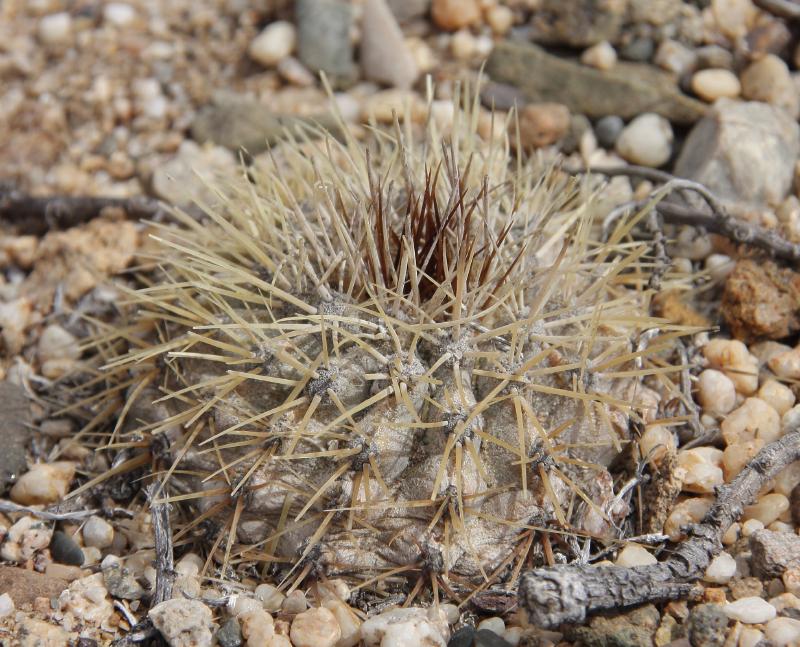 Bei den von Dir gezeigten Pflanzen ist dieser aufwärtsgerichtete Dorn sehr auffällig. Da alle drei zusammen vorkamen, liegt es nahe, dass es sich doch um eine Art unterschiedlichen Alters handelt. Zunächst dachte ich auch an junge C.cinerascens oder die var. intermedia, aber ein Vergleich des Dornenbilds schließt dies eher aus. Anbei noch ein Bild vom dem, was wir für Copiapoa cinerascens intermedia halten (Fundort südlich Barquito).