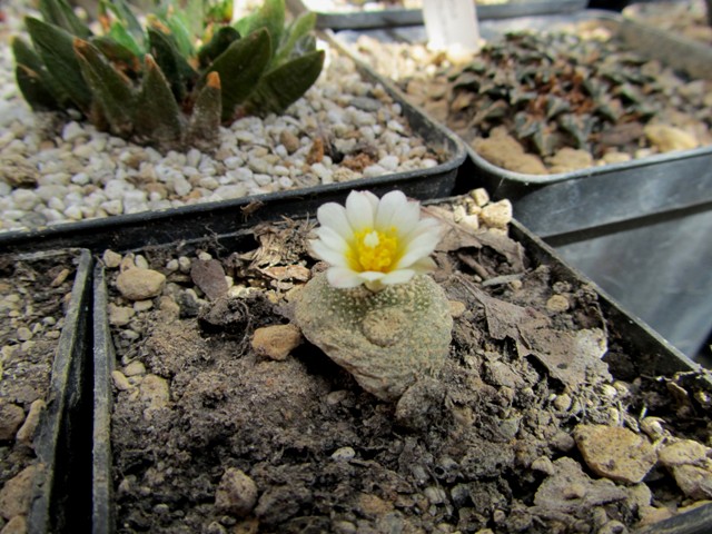 die Blossfeldia liliputana die Du mir im letzten Jahr beim Sommertreff bei Sarnes mitgebracht hast ist das erste zur Blüte gekommen.