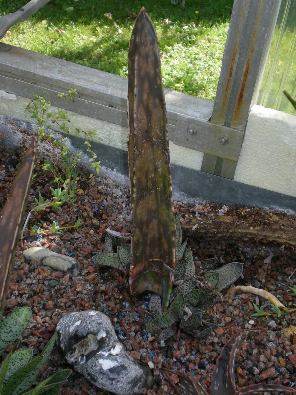Vor über zwei Jahren brach mir bei Ausräumen aus dem Gewächshaus in den Garten ein Blatt einer Gasteria excelsa ab. Dieses Blatt