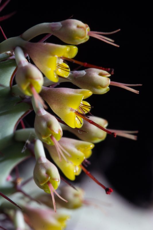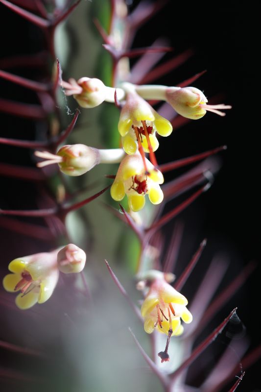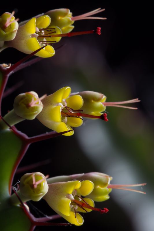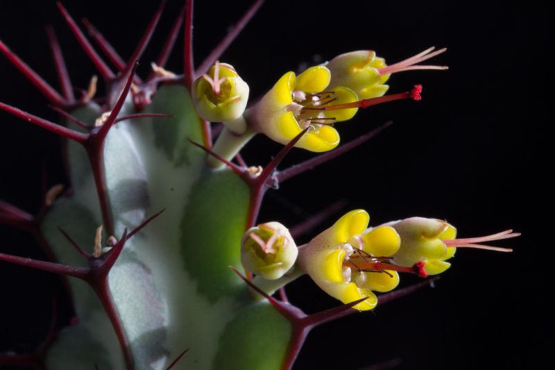 Der Grund, warum ich diese Art so mag: Sie ist schon ohne Blüten sehr dekorativ mit ihren blaugrün gemuszterten und rotbraun bedornten Trieben, und die zahlreichen, leuchtend gelben Blüten (ich weiß: Blütenstände / Cyathien) mit roten Staubfäden sind wirklich eine besondere Zierde. Auch wenn sie gattungstypisch nur etwa 3-4 mm Durchmesser haben ...
