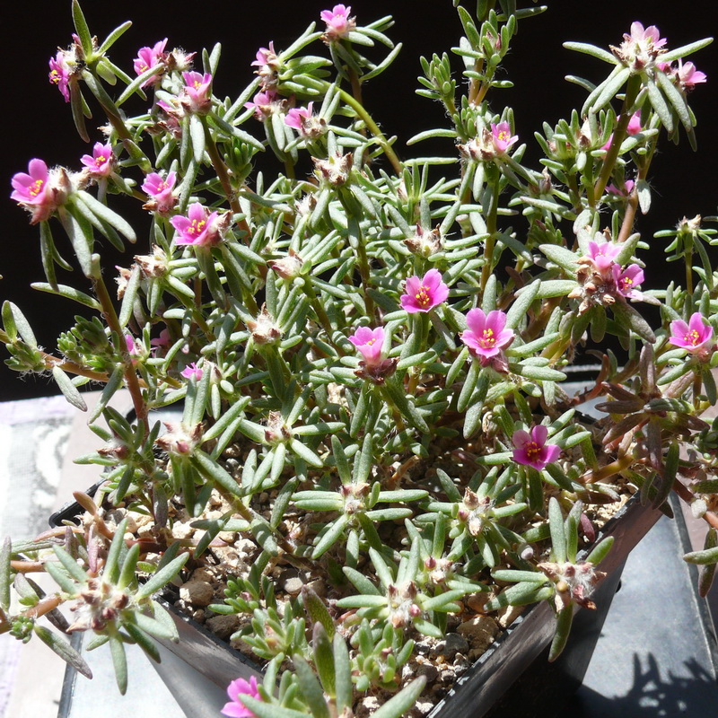 Auf Anfrage wurde mir in einem der Gartencenter gesagt, dass es eine Portulak-Art sei (definitiv korrekt), und zwar aus China (ziemlich sicher falsch), und außerdem - obwohl sie im Alpin-/Steingarten-Sortiment standen - NICHT winterhart. Ich habe sie trotzdem mal für kleines Geld mitgenommen und bin dann bei meiner Suche im Internet auf den Namen Portulaca gilliesii gestoßen.