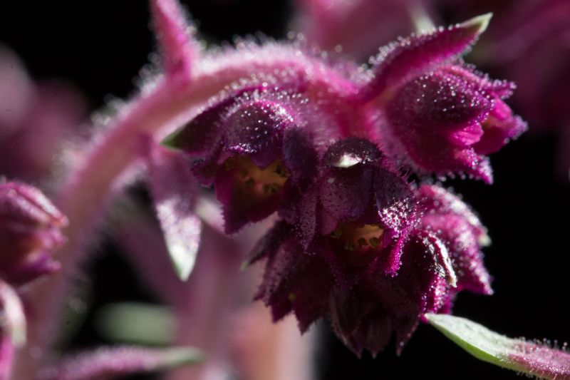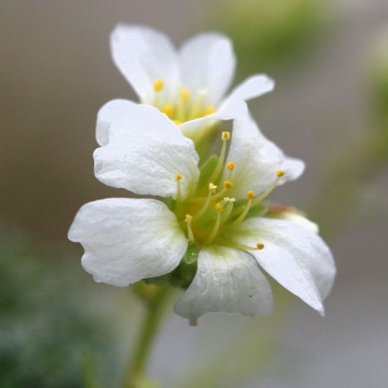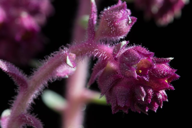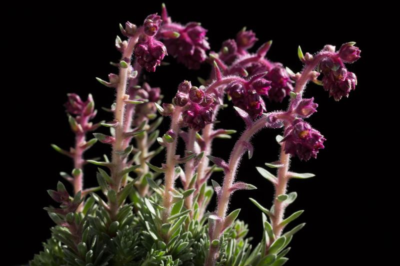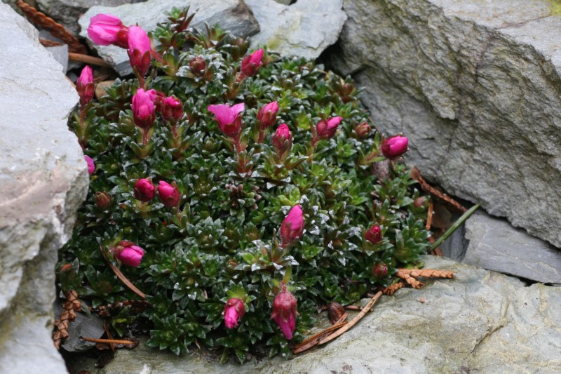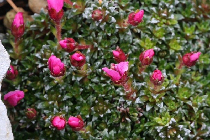 Was hier so auffällig gefärbt ist, sind die Blütenstiele und Kelchblätter. Anders als bei der Art, die Klaus gezeigt hat, und vielen anderen Saxifragen, hat man bei dieser Steinbrech-Verwandtschaft daher jetzt für mehrere Wochen was Buntes.