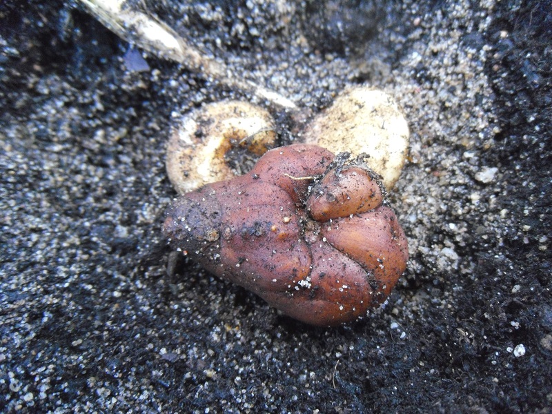 Nach dem Absterben der oberen Pflanzenteile hatte ich im Mai mal etwas nach den Knollen gegraben, um sie zu zeigen: