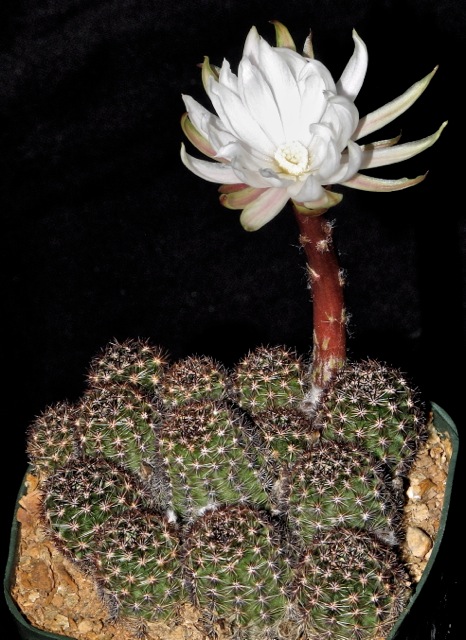 Laut neuerer Kakteenlexika gibt es die Art ja gar nicht, aber Pflanzen unter diesem Namen sehen nun mal anders aus als andere Pygmaeocereen. Sie bilden sehr schnell flache Sproßhaufen, ähnlich dem P. familaris, haben aber stärkere Dornen und eine längere und andersfarbige Blütenröhre.