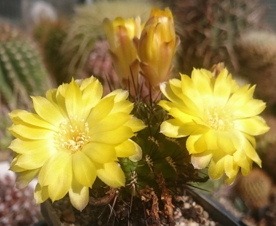 von S. steinbachii gibt es sehr viele Formen, die Art ist sehr variabel. Hier die Feldnummer MC 6332 (Martin Cardenas). Cardenas hat sie 1971 als Rebutia tuberculato-chrysantha erstbeschrieben. Bei mir im Frühbeet, mit fast direkter Sonneneinstrahlung, bildet sie schöne schwarze Dornen aus.