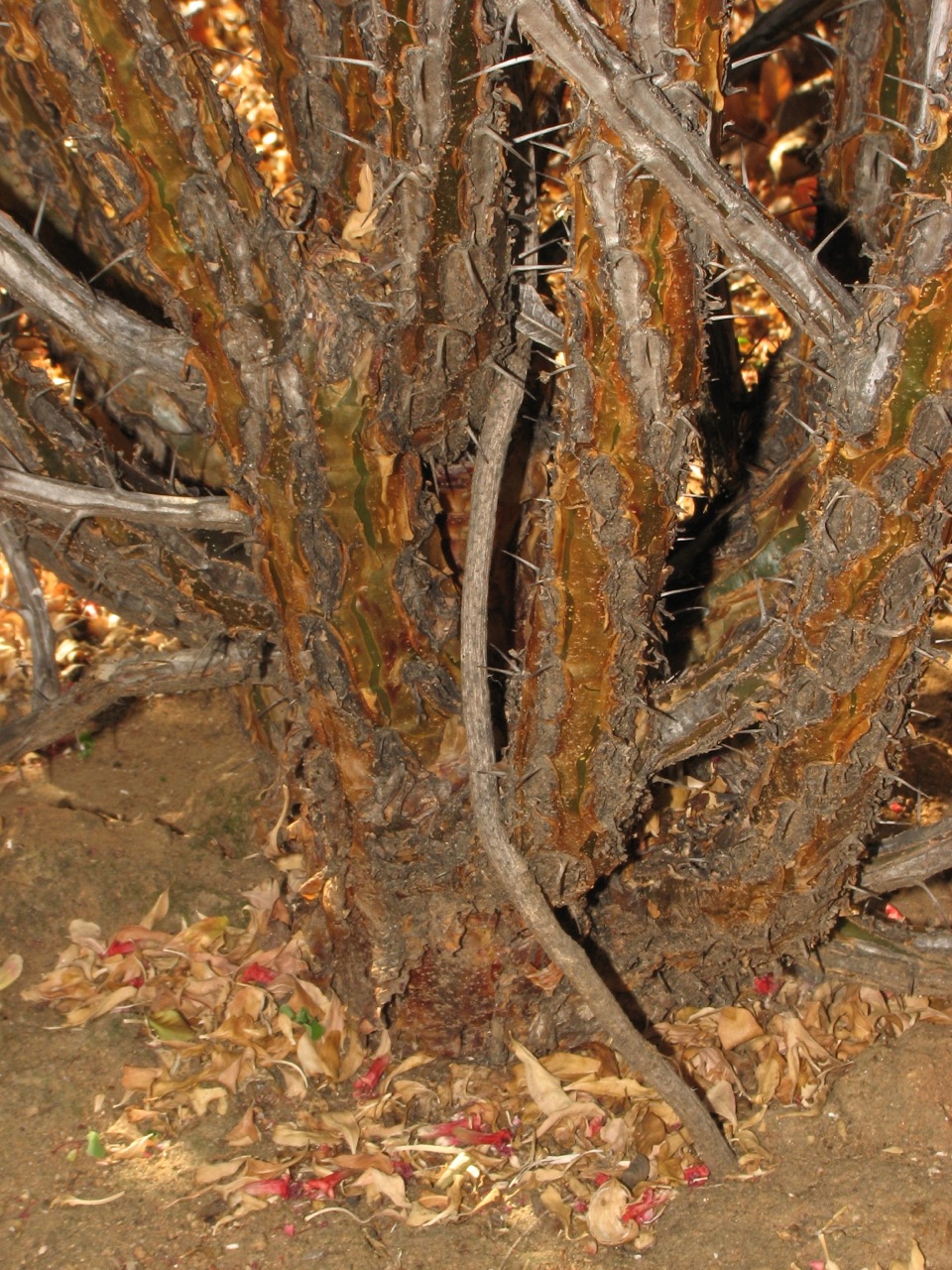 Und all die Blüten werden durch dieses dünne Stämmchen an der Basis der Fouquieria versorgt: