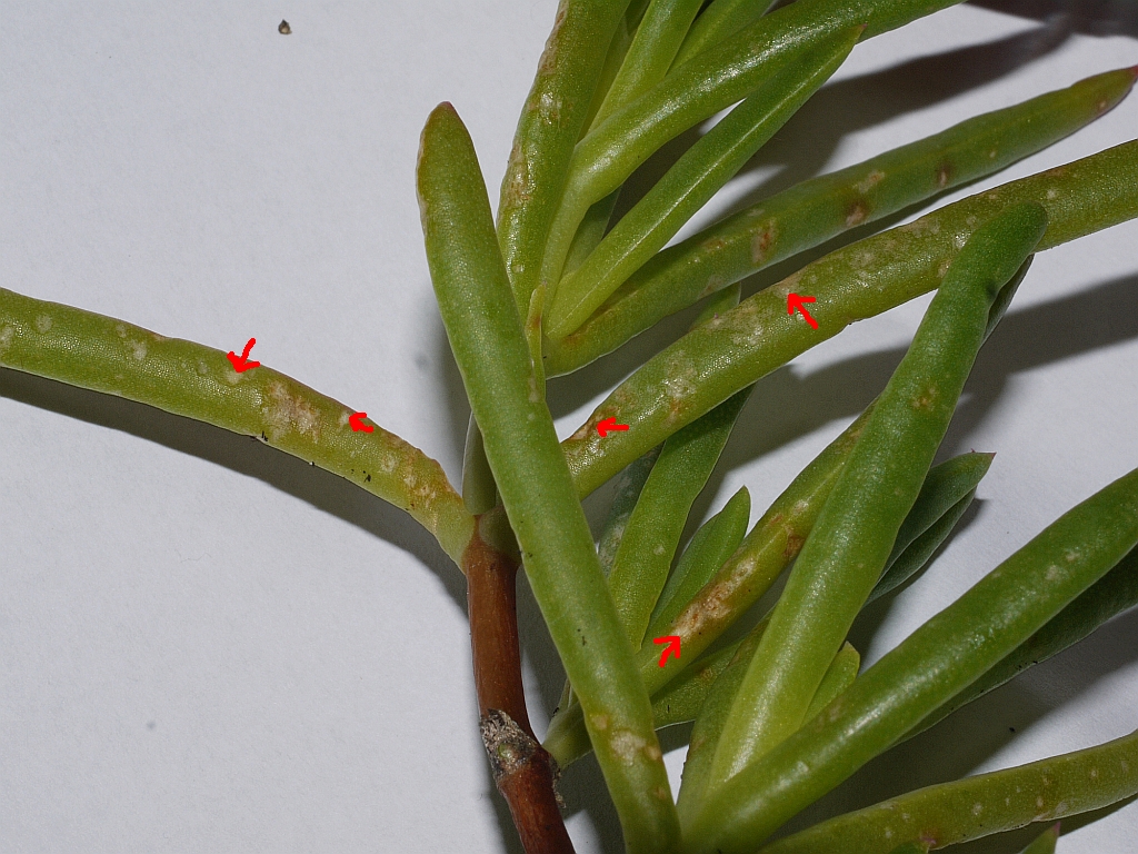 Gegen Thripse spricht weiterhin das Auftreten nur an einer „Sorte“ (Art?, Klon?) und vor allem: Das Auftreten nur im Winter.
