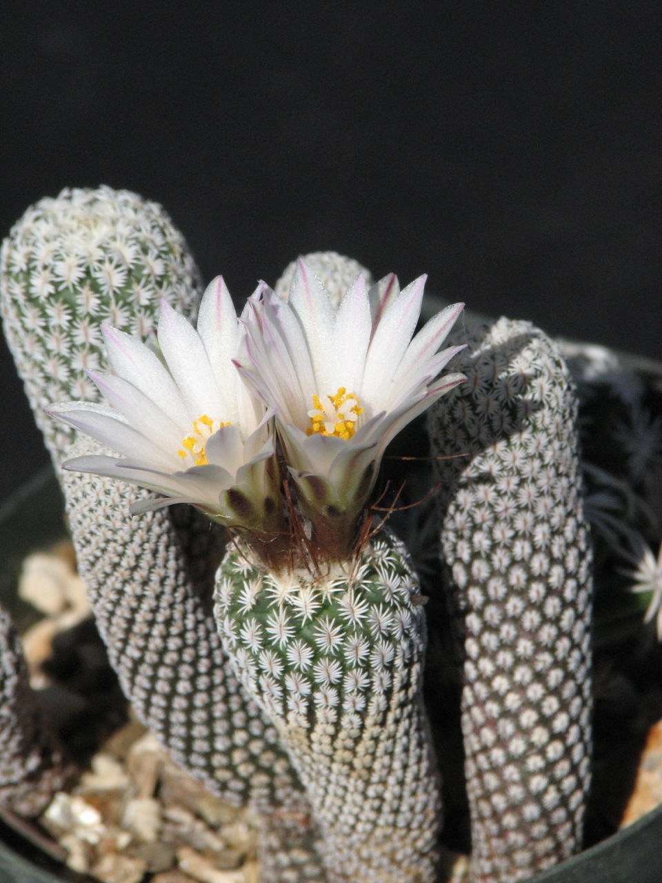 Ich hätte gesagt, der Unterschied des T. heliae zum T. krainzianus ssp. minimus besteht in Größe und Farbe der Blüte. Denn zumindest bei mir blühen beide und auch der Turbinicarpus macrochele zur selben Zeit.