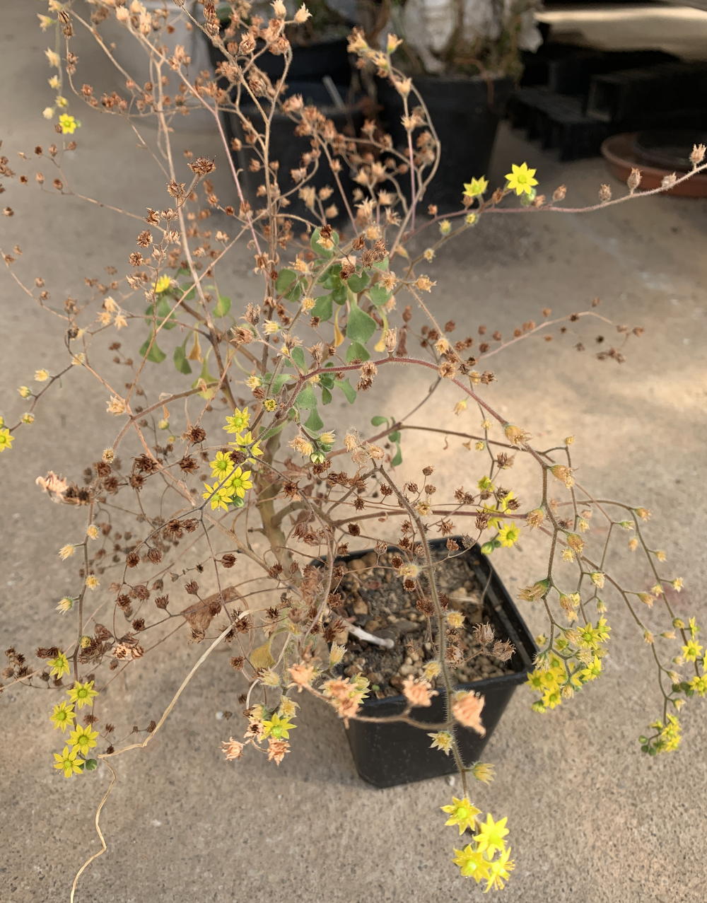 so sieht die Pflanze jetzt, nach der trockenen Überwinterung aus. Sie hat bei trockenem und kühlen Stand fast durchgängig geblüht. Sie ist offenbar auch selbstfertil, denn die samt sich munter durch die benachbarten Töpfe aus.